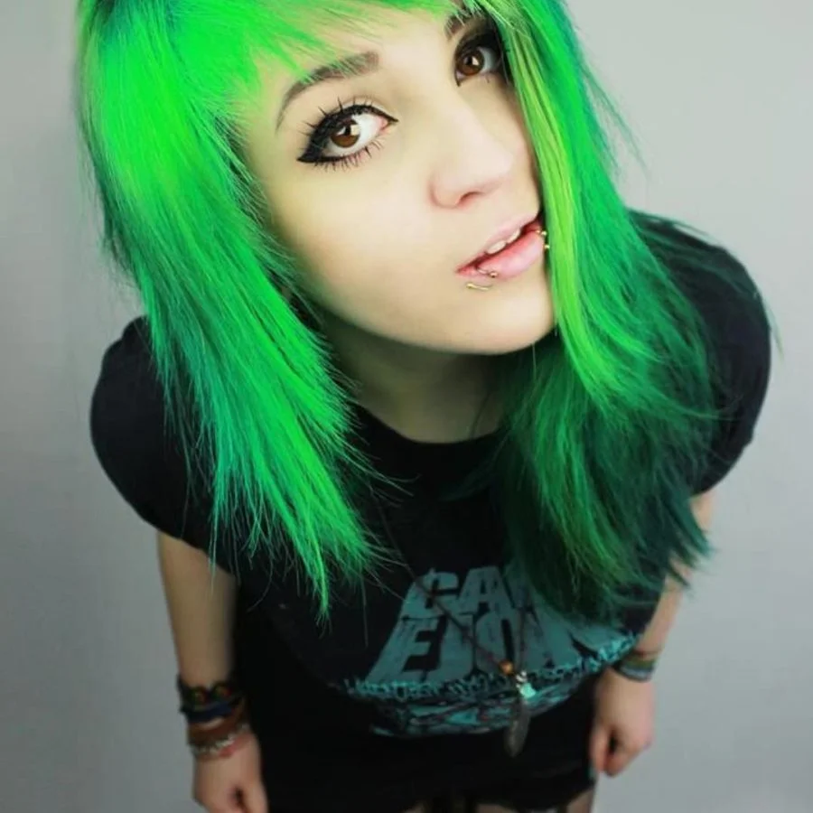 Green hair and dark eyes work together like a charm. Draw even more attention to your emo hairstyle by tweaking some of the classic style elements. Instead of the layered, fine fringe, ask for blunt cuts on both the bangs and the layered tresses.