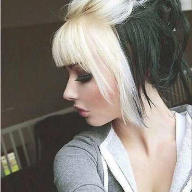 If you thought jet black is the only hair color you can sport with an Emo hairstyle for girls, think again. This is a telling example of how two vivid colors can be blended to create a refreshing Emo look. Blonde and fiery red are just two of the strong colors you can use to achieve a similar look. However, any strongly contrasting colors will do.